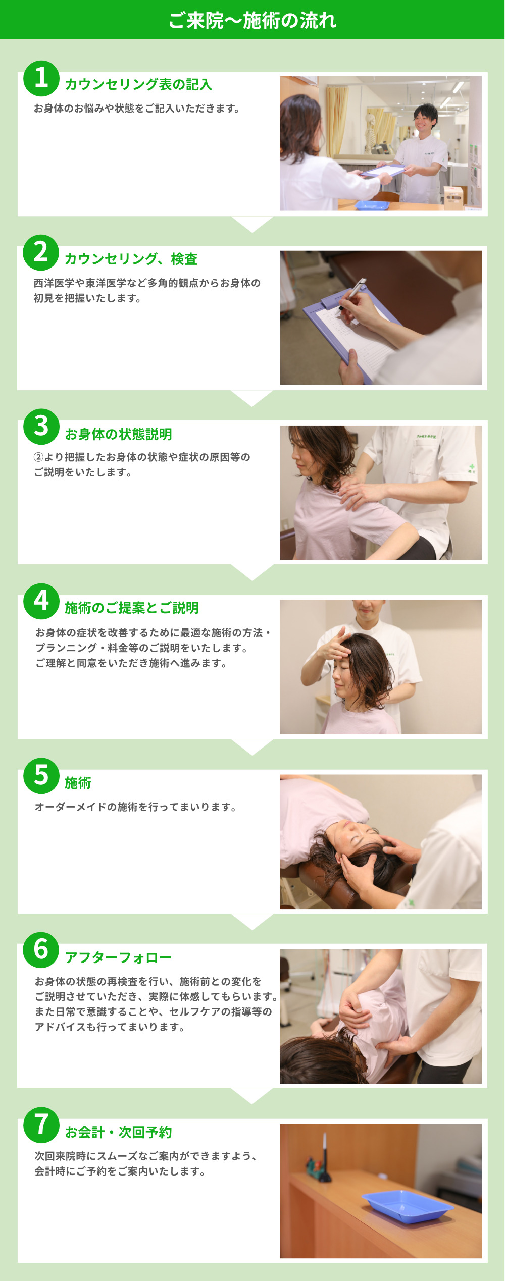 施術の回数を重ねてお身体の状態や症状・体質に変化がみられましたら、ご相談をしながら施術メニュー・プランの再構築を一緒に行ってまいります。